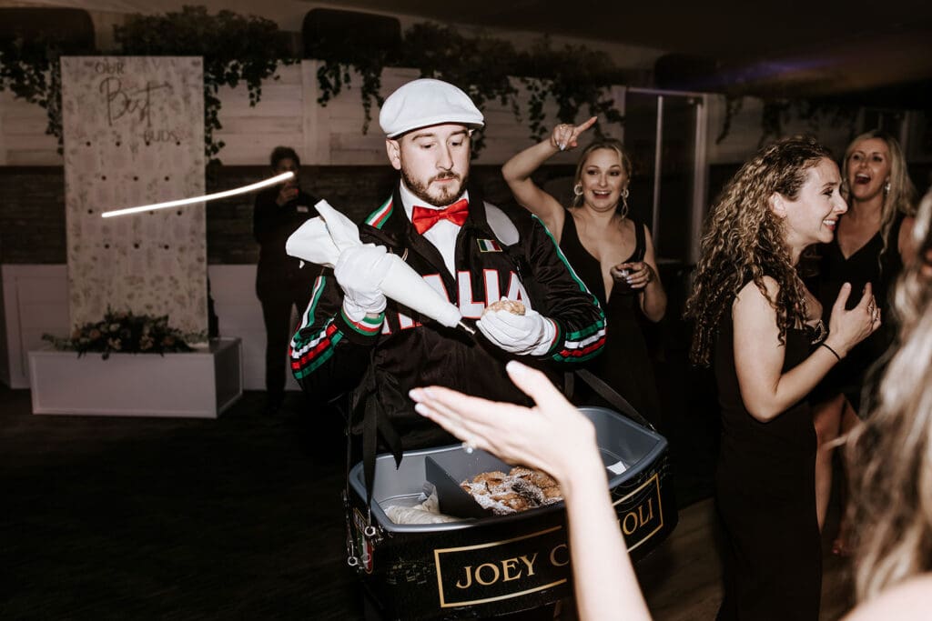 Yes, you read that right. Joey shows up to your reception, cannoli cart around his neck and dances his way around the party as he fills cannolis on demand. It’s hilarious, delicious and the vibe you didn’t know your wedding needed until now. Guests have the best time ever and the photos are gold.