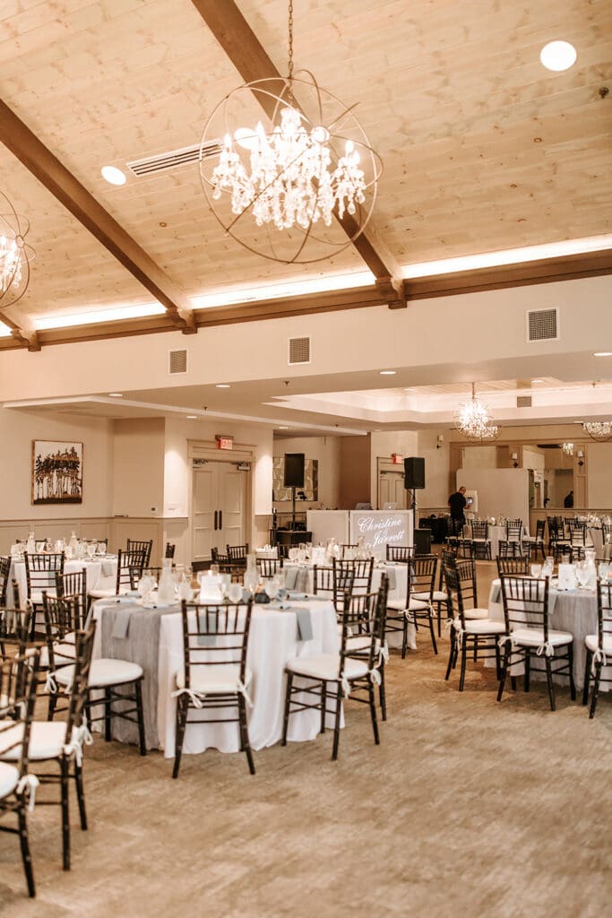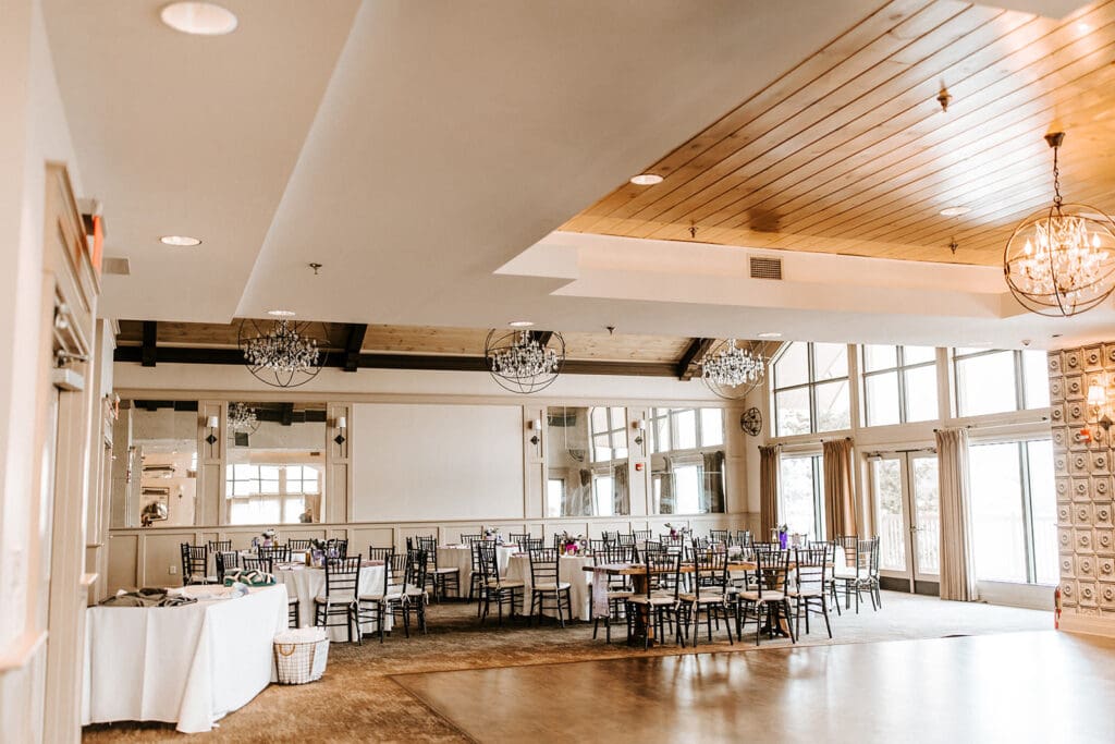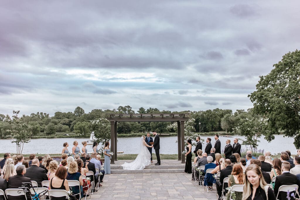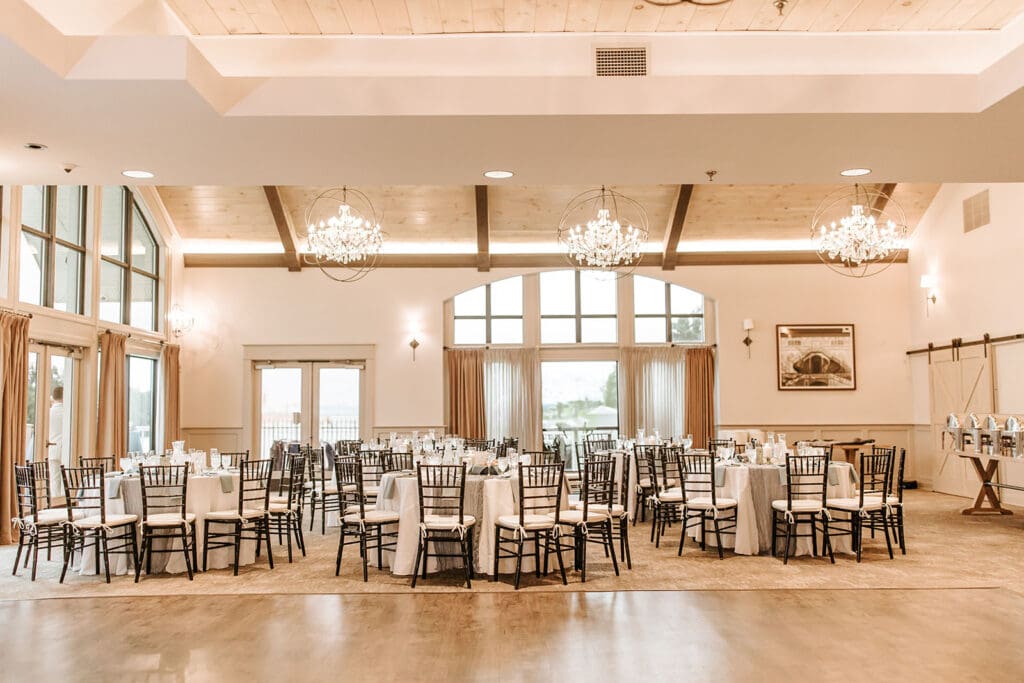 And if the weather has other plans? The Boathouse offers an indoor option that’s just as inviting. With vaulted ceilings, chandeliers and floor-to-ceiling windows, the ballroom transforms into a light-filled backdrop for your vows while still keeping the river and sky within view. Keep reading for more info on the ballroom space!