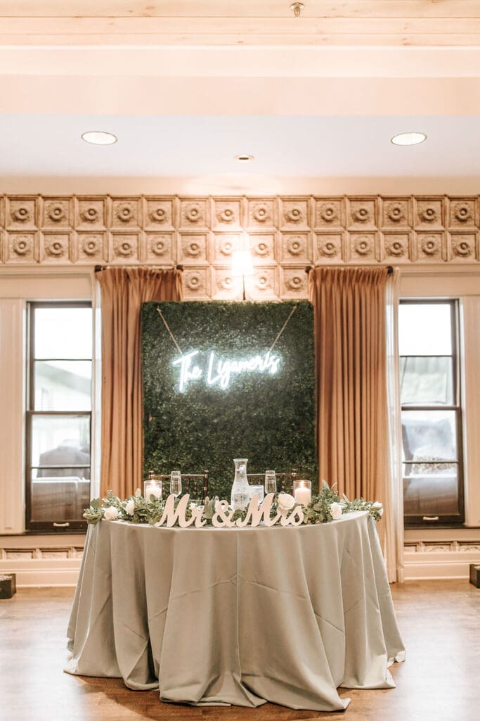The ballroom is designed to balance elegance with flexibility. Whether you’re dreaming about long rows of family-style dining or round tables accented with towering centerpieces, the space adapts beautifully! And for an unforgettable moment, couples can slip upstairs during the reception for portraits framed by the lights of the Philadelphia skyline.
