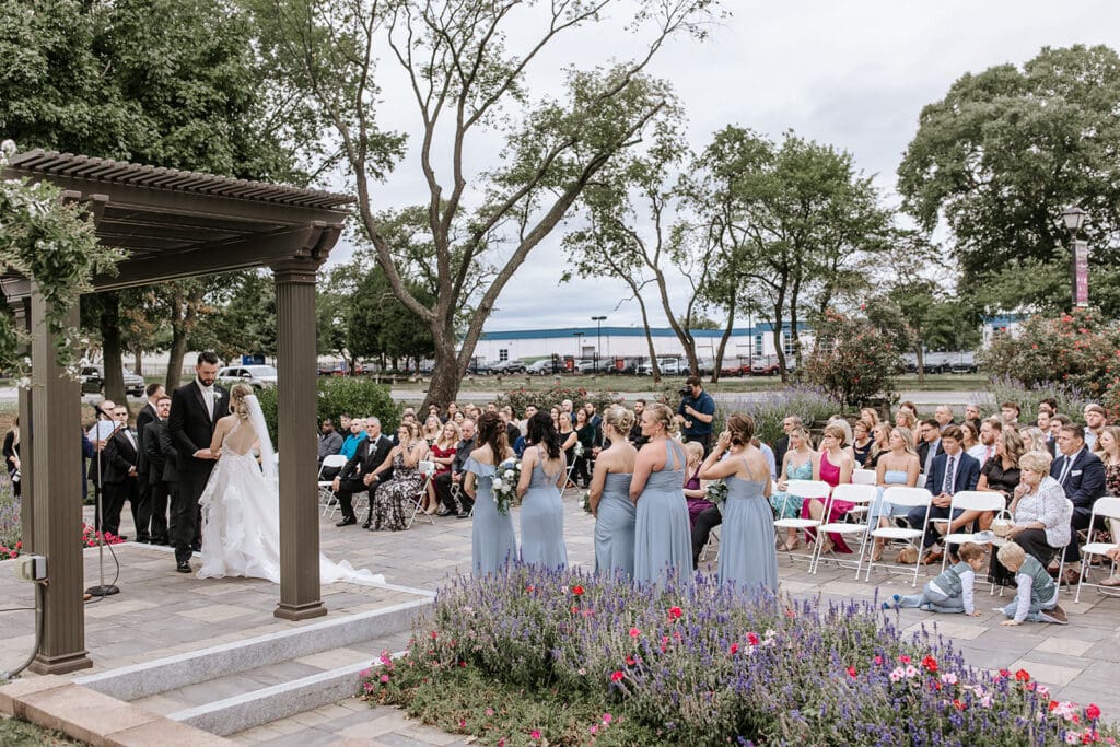Most couples choose to have their ceremony right at the water’s edge. The Cooper River stretches wide behind the ceremony space and on a lucky day, a sailboat drifts past, immersing guests into the landscape. The newly added matrimony garden, complete with pavers and a white pergola, creates a natural focal point while keeping the skyline and river in view.