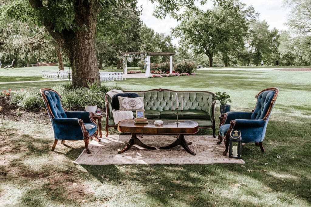 At the recent showcase, House of Vintage styled the cocktail hour area with vintage couches, detailed chairs and curated décor that turned the area into an inviting gathering space. Guests could picture themselves sipping signature cocktails on plush velvet seating, enjoying butlered hors d’oeuvres and mingling beneath the trees and open sky.