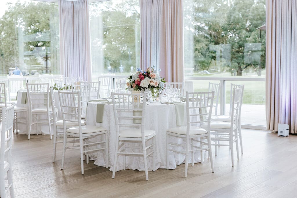 After cocktail hour, it’s time to celebrate and at Ramblewood, everything flows right into the Grande Ballroom. This elegant reception space features captivating floor-to-ceiling windows overlooking the rolling greens of the world-class golf course, giving guests a view that feels just as memorable as the day itself.